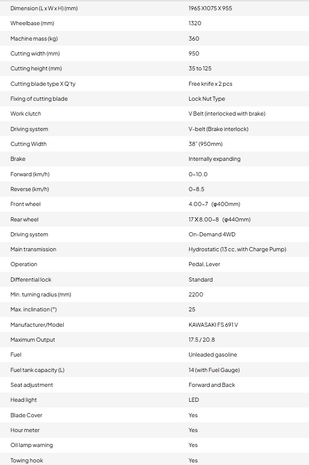 Capable of cutting grass, broom, gorse and saplings. Able to operate in wet muddy and hilly conditions. Clear overgrown areas of your property safely and with ease, due to excellent traction from tractor style mud grip tyres. Light steering with tight turning radius. Low centre of gravity. Industry first front suspension.